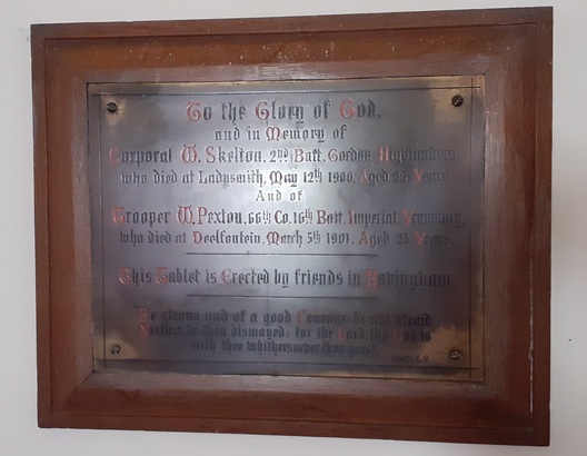 To the Glory of God, / and in Memory of / Corporal W. Skelton, 2nd Batt. Gordon Highlanders, / who died at Ladysmith, May 12th 1900. Aged 25 Years. / And of / Trooper W. Pexton, 66th Co. 16th Batt. Imperial Yeomanry, / who died at Deelfontein, March 5th 1901. Aged 25 Years./ This Tablet is Erected by friends in Hovingham. / 'Be strong and of a good Courage: be not afraid / Neither be thou dismayed: for the Lord thy God is / with thee whithersoever thou goest.' / Josh 1.9