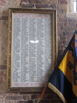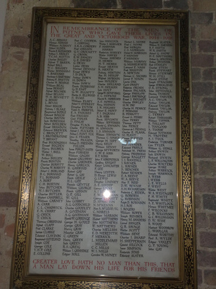 /IN REMEMBRANCE OF THE MEN OF/ PUTNEY WHO GAVE THEIR LIVES IN/ THE GREAT AND VICTORIOUS WAR. 1914 - 1918/ (Names)/ GREATER LOVE HATH NO MAN THAN THIS, THAT/ A MAN LAY DOWN HIS LIFE FOR HIS FRIENDS./