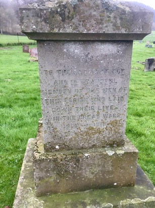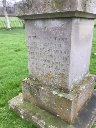 TO THE GLORY OF GOD/ AND IN GRATEFUL MEMORY OF THE MEN OF/ THIS PARISH WHO LAID/ DOWN THEIR LIVES/ IN THE GREAT WAR/ 1914 - 1918/ 1939 - 1945/ (names)