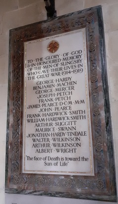 TO THE GLORY OF GOD / & IN HONOURED MEMORY / OF THE MEN OF SLINGSBY / WHO GAVE THEIR LIVES IN / THE GREAT WAR 1914-1919 / GEORGE HARDY / BENJAMIN MACHIN / GEORGE MERCER / JOSEPH PETCH / FRANK PETCH / JAMES PEARCE D.C.M. M.M. / JOHN PEARCE / FRANK HARDWICK SMITH / WILLIAM HARDWICK SMITH / ARTHUR SUGGITT / MAURICE SWANN / JONATHAN HARDY TINDALE / WALTER WILKINSON / ARTHUR WILKINSON / ALBERT WRIGHT / “The face of Death is toward the / Sun of Life”