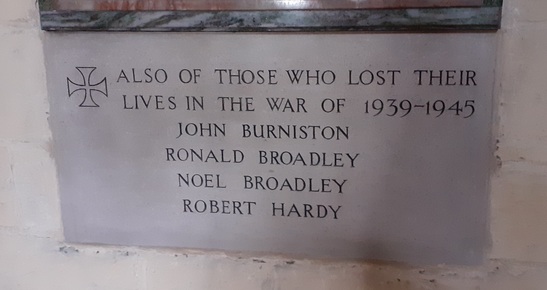 + ALSO OF THOSE WHO LOST THEIR / LIVES IN THE WAR OF 1939 -1945 / JOHN BURNISTON / RONALD BROADLEY / NOEL BROADLEY / ROBERT HARDY