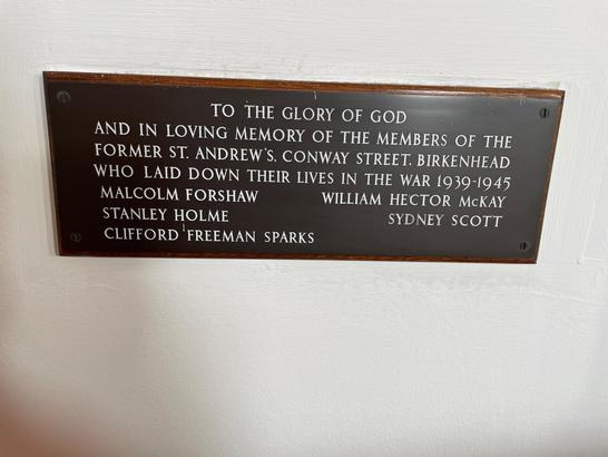 TO THE GLORY OF GOD/ AND IN LOVING MEMORY OF THE MEMBERS OF THE / FORMER ST ANDREW'S, CONWAY STREET, BIRKENHEAD/ WHO LAID DOWN THEIR LIVES IN THE WAR 1939-1945