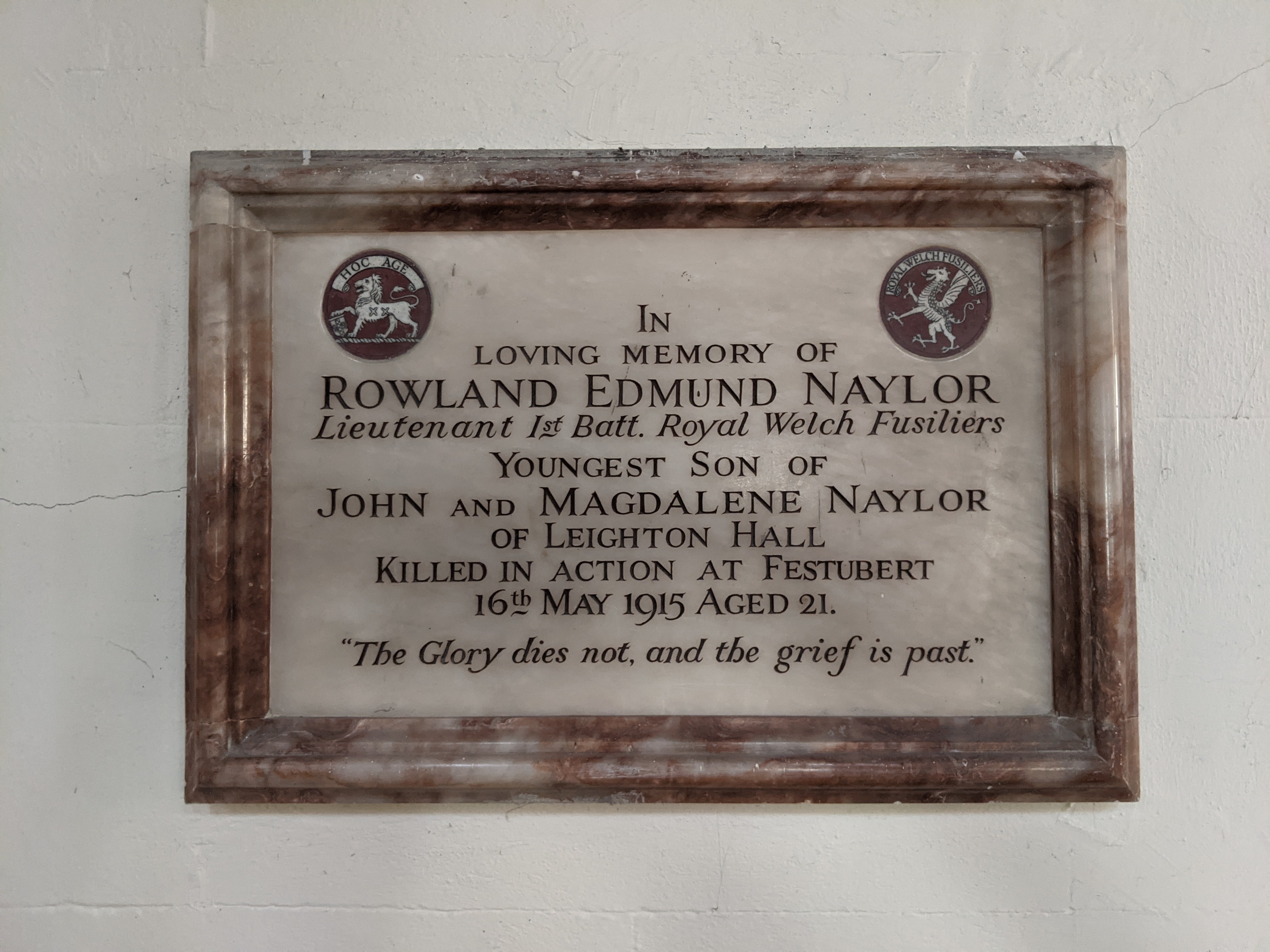 IN/ LOVING MEMORY OF/ ROWLAND EDMUND NAYLOR/ Lieutenant 1st Batt. Royal Welch Fusiliers/ YOUNGEST SON OF/ JOHN AND MAGDALENE NAYLOR/ OF LEIGHTON HALL/ KILLED IN ACTION AT FESTUBERT/ 16th MAY 1915 AGED 21/ "The Glory dies not, and the grief is past."