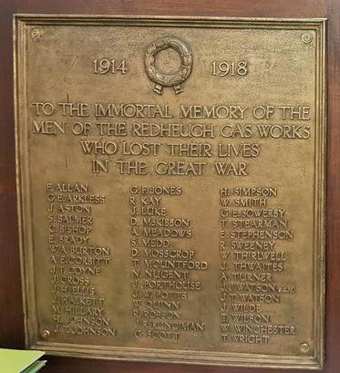 1914 1918/ TO THE IMMORTAL MEMORY OF THE/ MEN OF THE REDHEUGH GAS WORKS/ WHO LOST THEIR LIVES/ IN THE GREAT WAR/[45 names]