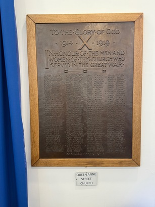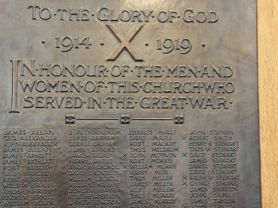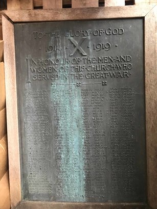TO THE GLORY OF GOD / 1914 X 1919 / IN HONOUR OF THE MEN AND / WOMEN OF THIS CHURCH WHO / SERVED IN THE GREAT WAR [names] X KILLED IN ACTION
