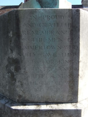[West side, facing Banbury Road: quotation from Proverbs 12:28] IN THE WAY / OF RIGHTEOUSNESS / IS LIFE / AND IN / THE PATHWAY / THEREOF / THERE IS NO / DEATH [East side, facing the church hall] IN PROUD / AND GRATEFUL / REMEMBRANCE / OF THE MEN OF / SUMMERTOWN WHO / NOBLY GAVE THEIR / LIVES FOR KING / AND COUNTRY AND / RIGHTEOUSNESS / IN THE GREAT WAR / 1914 – 1918 [Added immediately below this after World War 2]1939–1945