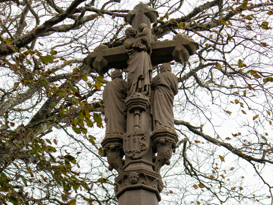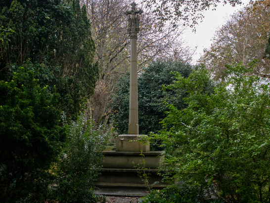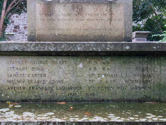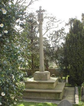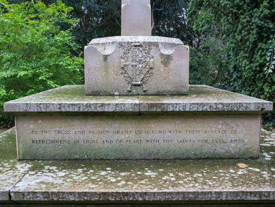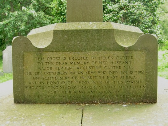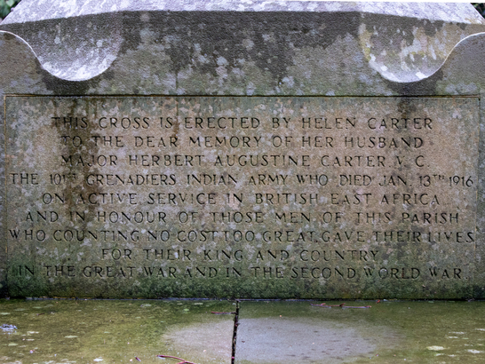 Front Face: THIS CROSS IS ERECTED BY HELEN CARTER/TO THE DEAR MEMORY OF HER HUSBAND/MAJOR HERBERT AUSTIN CARTER V.C./THE 101ST GRENADIERS INDIAN ARMY WHO DIED JAN 13TH 1916/ON ACTIVE SERVICE IN/BRITISH EAST AFRICA/AND IN HONOUR OF THOSE OF THIS PARISH/WHO COUNTING NO COST TOO GREAT GAVE THEIR LIVES/FOR KING AND COUNTRY/IN THE GREAT WAR AND IN THE SECOND WORLD WAR/WE HAVE NO GLORY GREAT ENOUGH FOR YOU/THIS LAND INVIOLATE THEY ARE MOURNED PROUDLY/(Names)/1939 - 1945. Other Faces: (Names) Top of Base: BY THE CROSS AND PASSION / GRANT US, OH LORD, WITH THEM, / A PLACE OF REFRESHMENT, OF LIGHT / AND OF PEACE WITH THY SAINTS / FOR EVER. AMEN