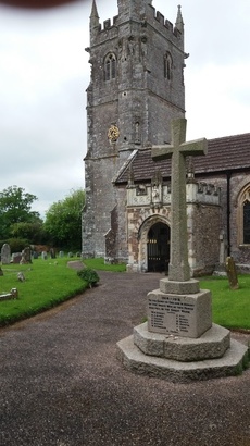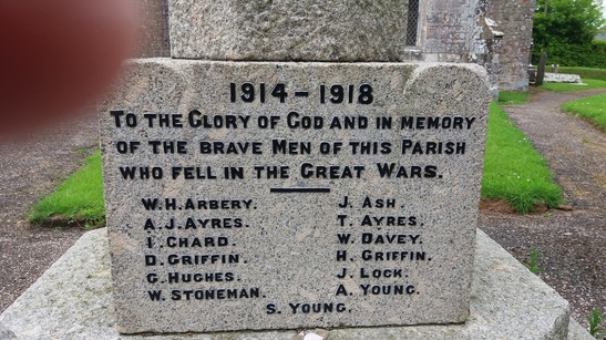 6 o'clock plinth face : 1914 -1918 / TO THE GLORY OF GOD AND IN MEMORY / OF THE BRAVE MEN OF THIS PARISH / WHO FELL IN THE GREAT WARS. / (13 NAMES) 12 o'clock plinth face : 1939 -1945 / (3 NAMES)
