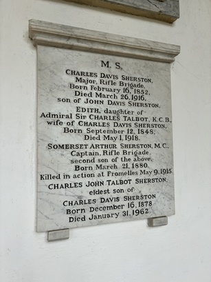 Excerpt: Somerset Arthur Sherston M.C. / Capt. Rifle Brigade / second son of the above / born March 21, 1880 killed in action at Fromelles, May 9, 1915