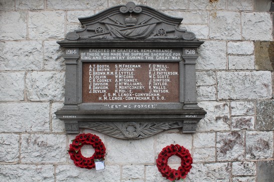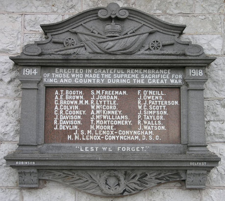 Column 1- A T Booth/ A E Brown/ G Brown MM/ A Colvin/ C R Cooney/ J Davison/ R Davison/ J Devlin; Column 2- S M Freeman/ J Jordan/ R Lyttle/ W McCord/ A McKinney/ J McWilliams/ T Montgomery/ H Moore; Column 3- F O'Neill/ J Owens/ R J Patterson/ W C Scott/ J Simpson/ P Taylor/ R Walls/ J Watson; Below the Columns- J S M Lennox-Conyngham/ H M Lenox-Conyngham, D.S.O.