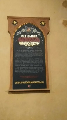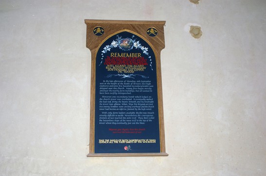 REMEMBER THE SEVEN MEN OF WYE FIRE SERVICE WHO SAVED THE PILGRIK CHURCH OF ALL SAINTS FROM DETRUCTION BY FIRE BOMBS(names) IN THE LATE AFTERNOON OF MONDAY 16TH SEPTEMBER 190 AT HE HEIGHT OF THE BATTLE OF BRITAIN. TWO HIGH EXPLOSIVE AND SOME FIVE HUNDRED INCENDIARY BOMBS WERE DROPPED NEAR THIS CHURCH.MANY FIRES BEGAN MOSTLY AMONGST THE NEARBY FARM BUILDINGS BUT LL SEEMED TO HAVE BEEN SWIFTLY EXTINGUISHED.HOWEVER ONE INCENDIARY BOMB WHICH LODGED ON THE CHURCH TOWER WAS OVERLOOKED,IT EVENTUALLY MELTED THE LEAD ROOF FIRING THE BEAMS BENEATH AND BY MIDNIGHT THE TOWER WAS AFLAME.WHEN WYE FIRE BRIGADE ARRIVED TWO ENEMY BOMBERS WERE CIRCLING OVERHEAD AND THE CHURCH TOWER HAD BECOME AN INFERNO FANNED BY THE HIGH WIND.WITH ONLY FARM LADDERS AVAILABLE THE FIRE WAS TREACHEROUSLY DIFFICULT TO TACKLE. NEVERTHLESS THE COURAGEOUS FIREMEN AT LAST REACHED THE AISLE ROOF.THEY THEN SCALED THE HAZARDOUS SLOPED OF THE NAVE ROOF TO THE TOP OF THE TOWER WHERE THY EVNTUALLY PUT OUT THE BLAZE.PILGRIM GIVE THANKS THAT THIS CHURCH SURVIVED THE HOLOCAUST OF WAR. TAKE SHIELD OF FAITH WHEREWITH YE SHAL QUENCH ALL THE FIERY DARTS OF THE WICKED EPH6.16