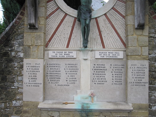 WW1 names G Barkwill, H Barkwill, C Brimley, J Clapshaw, W Cresswell, H Cresswell, C Crowther, P Edgeler, A Elliott, G Frogley, J Harding, E V Harding, G A Hervey, W Hooper, H Hoy, G Judge, W Lemon, V Luff, F Madgwick, W Moore, M Newman, C Nightingale, P Rapson, W Robinson, C Selwyn, A P Selwyn, G V C Selwyn, W Short, W Snelling, L Snelling, A Steer H Towell, B White, W Wood, B Wood, C Wood, J Voller WW11 names J W Audsley, R F Clarke, A J P Golder, F R Hill, A E Job, G Jones, R Luff, S F Mansbridge, R R T North, E A E Phillips, E R Porter, W C Ramage, P W Rapson, G Redhead, S F Roe, J R B Sidebotham, J H Whitcomb