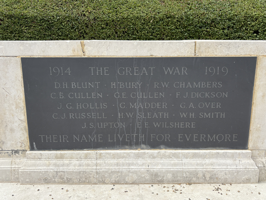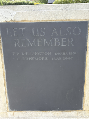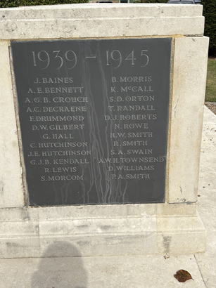 Memorial Stone LH Tablet 1939 - 1945 J Baines, A E Bennet, A G B Crouch, A C Decraene, F Drummond, D W Gilbert, G Hall, C Hutchinson, J E Hutchinson, G J B Kendall, R Lewis, S Morcom, B Morris, K McCall, S D Orton, T Randall, D J Roberts, N Rowe, H W Smith, R Smith, S A Swain, A W H Townsend, D Williams, P A Smith Memorial Stone RH Tablet Let Us Also Remember F B Millington Korea 1951 C Dunsmore Iraq 2007