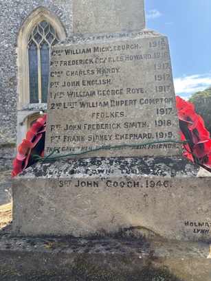(WW1) CORP. WILLIAM MICKLEBURGH . 1916. / PTE. FREDERICK CHARLES HOWARD. 1916. / CORP. CHARLES HARDY. 1917. / PTE. JOHN ENGLISH. 1917. / L/CPL. WILLIAM GEORGE ROYE. 1917. / 2ND LIEUT. WILLIAM RUPERT COMPTON FFOLKES. 1917. / RFL. JOHN FREDERICK SMITH. 1918. / PTE. FRANK SIDNEY SHEPHARD. 1919. / (WW2) PTE. VICTOR EDWIN THURSTON. 1945. / (1946) SGT. JOHN GOOCH. 1946.