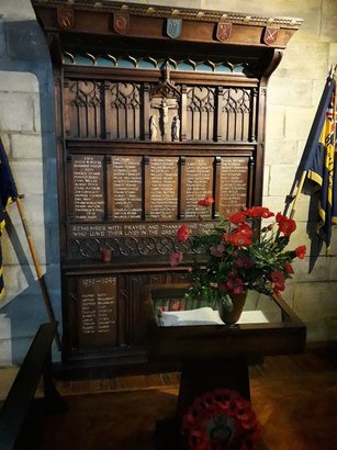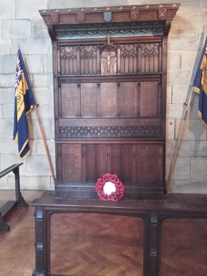 The names of the fallen in the First World War are listed, below which is THE INSCRIPTION: REMEMBERING WITH PRAYER AND THANKSGIVING, THESE OUR BROTHERS WHO GAVE THEIR LIVES IN THE GREAT WAR 1914-1919 The lower part of the memorial lists the fallen in the Second World War