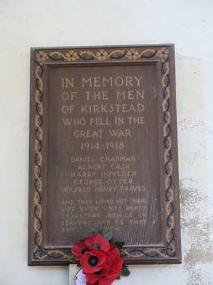 In memory of the men of Kirkstead who fell in the Great War 1914-1918 [names] And they loved not their life even unto death therefore rejoice oh heavens and ye that dwell in them