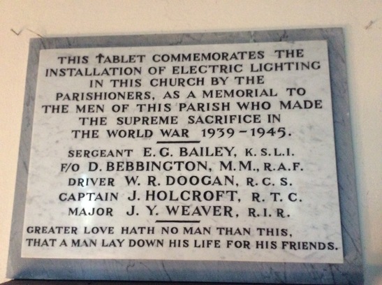 THIS TABLET COMMEMORATES THE/INSTALLATION OF ELECTRIC LIGHTING/IN THIS CHURCH BY THE/PARISHONERS, AS A MEMORIAL TO/THE MEN OF THIS PARISH WHO MADE/THE SUPREME SACRIFICE IN/THE WORLD WAR 1939 - 1945/(names)/"GREATER LOVE HATH NO MAN THAN THIS, THAT A MAN LAY DOWN HIS LIFE FOR HIS FRIENDS"