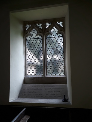 Inscription and names at bottom of window - Taken by Ynyr Owen 27 Mar 2019
