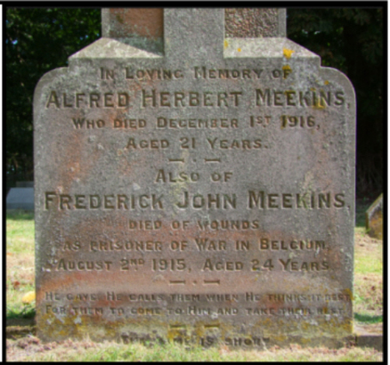 ALSO // FREDERICK JOHN MEEKINS // DIED OF WOUNDS //AS PRISONER OF WAR IN BELGIUM // AUGUST 2ND 1915 AGED 24 YEARS // HE GAVE, HE CALLS THEM WHEN HE THINKS IT BEST // FOR THEM TO COME TO HIM AND TAKE THEIR REST // TIME IS SHORT