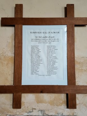 RUMBURGH ROLL OF HONOUR / TO THE GLORY OF GOD / and in Memory of those from this Parish who / have fallen and those who have fought in the / Great War 1914-1919 / (Names) //