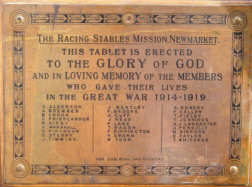 RACING STABLES MSSION NEWMARKET // THIS TABLE IS ERECTED // TO THE GLORY OF GOD // AND IN LOVING MEMORY OF THE MEMBERS // WHO GAVE THEIR LIVES // IN THE GREAT WAR 1914-1919 // (names in 3 columns) // FOR GOD, KING AND COUNTRY