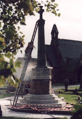 Renovation of WW1 Memorial, October 1998. The plaques were removed and taken away and the names re-inscribed, and were replaced in time for the red-dedication on Remembrance Sunday 1998. - Taken by David Long 21 Oct 1998
