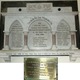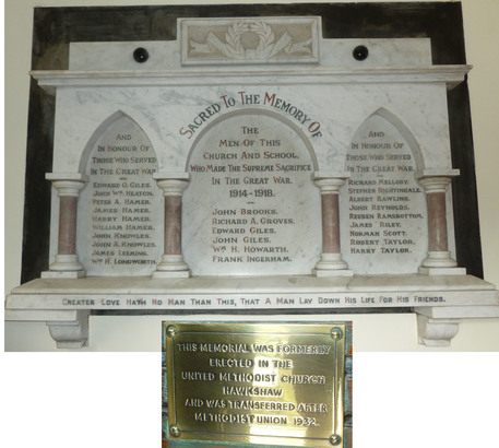 Above Central Panel: SACRED TO THE MEMORY OF CENTRAL PANEL: THE/ MEN OF THIS/ CHURCH AND SCHOOL,/ WHO MADE THE SUPREME SACRIFICE/ IN THE GREAT WAR./ 1914-1918/ (names); Left Panel: AND/ IN HONOUR OF/ THOSE WHO SERVED/ IN THE GREAT WAR/ (names); Right Panel: AND/ IN HONOUR OF/ THOSE WHO SERVED/ IN THE GREAT WAR/ (names); Base Border- GREATER LOVE HATH NO MAN THAN THIS, THAT A MAN LAY DOWN HIS LIFE FOR HIS FRIENDS; Brass Plaque-THIS MEMORIAL WAS FORMERLY/ERECTED IN THE/UNITED METHODIST CHURCH/HAWKSHAW/AND WAS TRANSFERRED AFTER/METHODIST UNION 1932