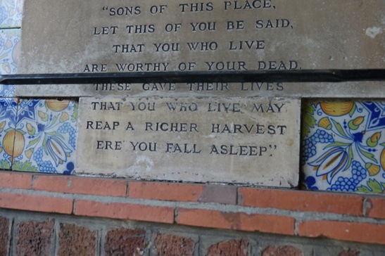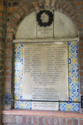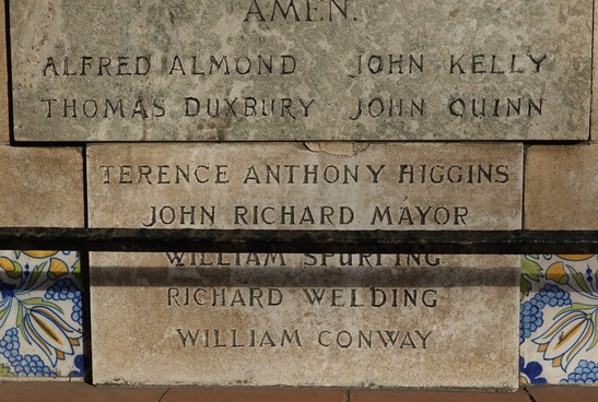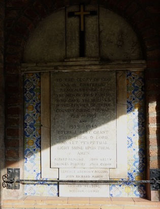 Left Tablet: QUI MERUIT/ FERAT/ REMEMBER/ (Names)/ "SONS OF THIS PLACE,/ LET THIS OF YOU BE SAID,/ THAT YOU WHO LIVE/ ARE WORTHY OF YOUR DEAD./ THESE GAVE THEIR LIVES./ REAP A RICHER HARVEST/ ERE YOU FALL ASLEEP" Right Tablet: TO THE GLORY OF GOD/ AND IN GRATEFUL/ REMEMBRANCE OF/ THE MEN OF THIS PARISH/ WHO GAVE THEIR LIVES/ IN THE SERVICE OF THEIR/ COUNTRY DURING THE WAR/ 1914 - 1919/ AND/ 1939 -1945/ ETERNAL REST GRANT/ THEM O LORD,/ AND LET PERPETUAL/ LIGHT SHINE UPON THEM./ AMEN/ (30 WW1 and 9 WW2 Names)