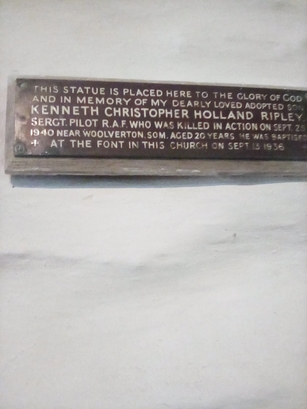 This statue is placed here to the glory of God and in memory of my dearly loved adopted son Kenneth Christopher Holland Ripley. Sergt. Pilot R.A.F. who was killed in action on Sept. 25 1940 near Woolverton. Som. Aged 20 years. He was baptised at the font in this church on Sept. 13 1936.