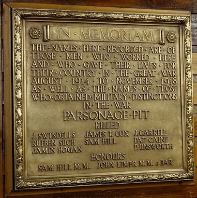 In Memoriam The names here recorded are of those men who worked here and who gave their lives for their country in the Great War August 1914 to November 1918, as well as the names of those who obtained military distinctions in the war Parsonage Pit