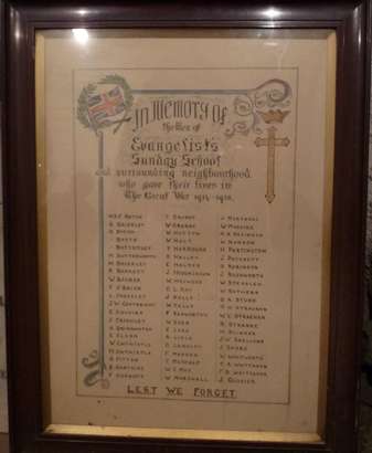 IN MEMORY OF/The Men of/Evangelists/Sunday School/and surrounding neighbourhood/who gave their lives in/The Great War 1914-1918/[names]/LEST WE FORGET