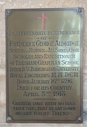 IN AFFECTIONATE REMEMBRANCE / OF / FREDERICK GEORGE ALDRIDGE / SERVER AND MEMBER OF ALL SAINT'S CHOIR / SCHOLAR AND EXHIBITIONER / OF EVESHAM GRAMMAR SCHOOL / INTER B.SC. BIRMINGHAM UNIVERSITY / ROYAL ENGINEERS. M.M. D.C.M. / BORN JANUARY 16TH 1896, / DIED FOR HIS COUNTRY, / APRIL 3RD 1918. / GREATER LOVE HATH NO MAN / THAN THIS, THAT HE LAY DOWN / HIS LIFE FOR HIS FRIENDS. //
