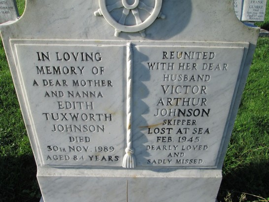 Reunited with her dear Husband/Victor Arthur Johnson Skipper/ lost at sea Feb. 1945/"Dearly loved, sadly missed."