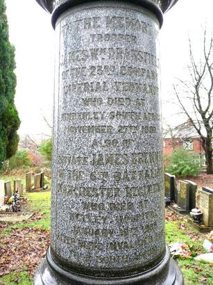 TO THE MEMORY OF/TROOPER/JAMES WM. DRANSFIELD/OF THE 23RD COMPANY/IMPERIAL YEOMANRY/WHO DIED AT/KIMBERLEY, SOUTH AFRICA/NOVEMBER 27TH 1900/ALSO OF/PRIVATE JAMES BRENNAN/OF THE 6TH BATTALION/MANCHESTER REGIMENT/WHO DIED AT/NETLEY HOSPITAL/JANUARY 10TH 1902/AFTER BEING INVALIDED HOME/FROM SOUTH AFRICA