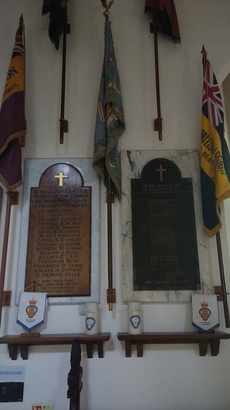 WW1 : + / TO THE GLORY OF GOD / AND IN GRATEFUL MEMORY / OF THE LIVES LAID DOWN IN THE CAUSE OF FREEDOM / 1914 -1918 / (names) / MAY THEY REST IN PEACE /// WW2 : + / IN PROUD AND GRATEFUL / MEMORY OF LIVES NOBLY / LAID DOWN IN THE CAUSE / OF FREEDOM AND JUSTICE / 1939 - 1945 / (14 names) / WHEN YOU GO HOME / TELL THEM OF ME AND SAY / FOR YOUR TOMORROW / WE GAVE OUR TODAY.