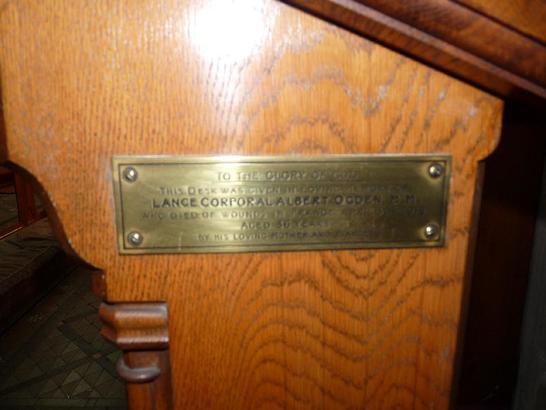 TO THE GLORY OF GOD/THIS DESK WAS GIVEN IN LOVING MEMORY OF/LANCE CORPORAL ALBERT OGDEN MM/WHO DIED OF WOUNDS IN FRANCE APRIL 30TH 1918/AGED 36 YEARS/BY HIS LOVING MOTHER AND FATHER
