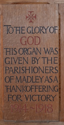 TO THE GLORY OF GOD THIS ORGAN WAS GIVEN BY THE PARISHIONERS OF MADLEYAS A THANKOFFERING FOR VICTORY 1914 – 1918