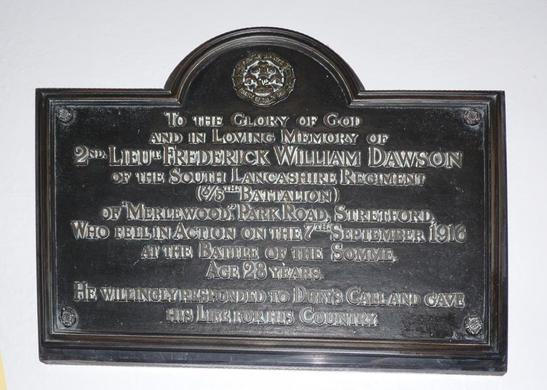 TO THE GLORY OF GOD/AND IN LOVING MEMORY OF/2ND LIEUT FREDERICK WILLIAM DAWSON/OF THE SOUTH LANCASHIRE REGIMENT/(3/5TH BATTALION/OF MERLEWOOD PARK ROAD, STRETFORD/WHO FELL IN ACTION ON THE 7TH SEPTEMBER 1916/AT THE BATTLE OF THE SOMME/AGE 28 YEARS/HE WILLINGLY RESPONDED TO DUTY'S CALL AND GAVE/HIS LIFE FOR HIS COUNTRY