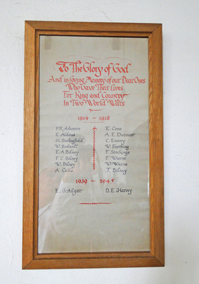 TO THE GLORY OF GOD/ AND IN LOVING MEMORY OF OUR DEAR ONES/ WHO GAVE THEIR LIVES/ FOR KING AND COUNTRY/ IN TWO WORLD WARS/ 1914-1918/ (16 Names)/ 1939-1945/ (2 Names)