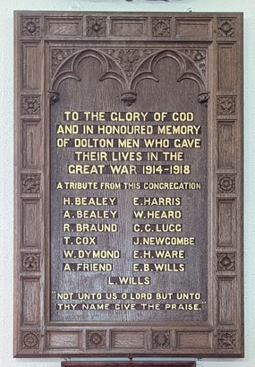 TO THE GLORY OF GOD / AND IN HONOURED MEMORY / OF DOLTON MEN WHO GAVE / THEIR LIVES IN THE / GREAT WAR 1914 - 1918 / A TRIBUTE FROM THIS CONGREGATION / (13 NAMES) / "NOT UNTO US LORD BUT UNTO / THY NAME GIVE THE PRAISE."