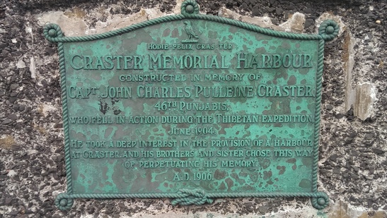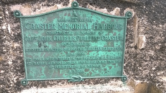 HODIE FELIX CRAS TER/CRASTER MEMORIAL HARBOUR/CONSTRUCTED IN/MEMORY OF/CAPT. JOHN CHARLES PULLEINE CRASTER/46TH PUNJABIS/WHO FELL IN ACTION DURING THE TIBETAN EXPEDITION/JUNE 1904/HE TOOK A DEEP INTEREST IN THE PROVISION OF A HARBOUR/AT CRASTER AND HIS BROTHERS AND SISTERS CHOSE THIS WAY/OF PERPETUATING HIS MEMORY/AD 1906