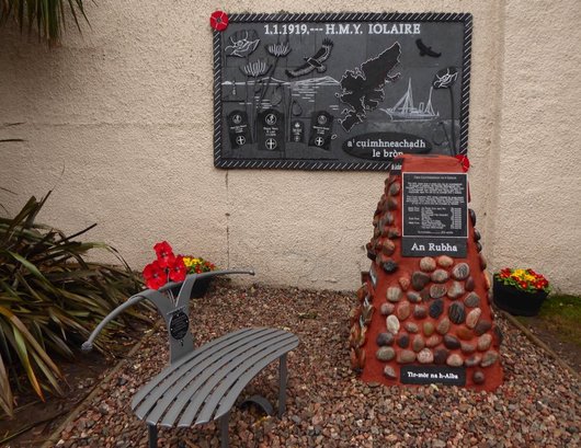 Pictorial Tablet- 1.1.1919----HMY IOLAIRE Royal Navy Reserve/173 Lost/1-1-1919 Royal Navy/6 Lost/1-1-1919 Royal Marine Light Infantry/1 Lost/1-1-1919 Mercantile Marine-21 Lost/1-1-1919 a'cuimhneachadh/le bron Dedication Tablet- Carn Cuimhneachain na h-Iolaire/Tha 201 clach anns a' charn sea, air an cruinneachadh/le aigridh a Leodhas, Na Heatadh, Bearnagraigh (Na/Hearadh), Tir-mor na h-Alba agus Sasainn. Tha gach clach/a' riochdachadh nam bailtean bhan tainig gach fear a/chailleadh, agus tha iad air an cumadh mar a leanas: This Cairn contains 201 stones collected by young people/from Lewis, Harris, Berneray (Harris), Scottish Mainland/and England. Each stone comes from the home village, town/or city of a victim and are arranged as follows: North Face An Toabh Siar agus Nis 51 caillie South Face Na Lochan 33 caillie Na Hearadh 5 caillie Bearnaraigh (Na Hearadh) 2 caillie Sasainn 18 caillie East Face An Rubha 39 caillie Tir-mar na h-Alba 2 caillie West Face Sgire Steomabhaigh 8 caillie Tolastadh agus Am Bac 20 caillie Uig agus Bearnaraigh 23 caillie Gu h-iomlan.......... 201 caillie