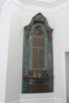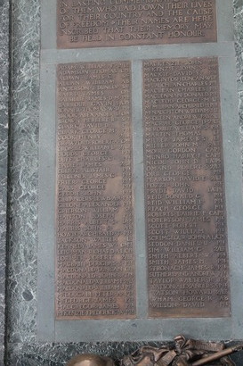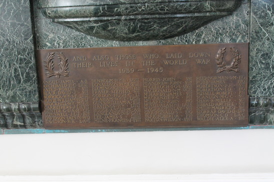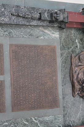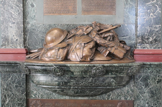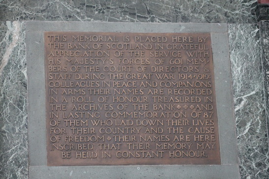 This Memorial is placed here by the Bank of Scotland in grateful appreciation of the services with His Majesty’s Forces of 601 members of the Court of Directors and Staff during the Great War 1914-1919: colleagues in peace and companions in arms, their names are recorded in a Roll of Honour treasured in the archives of the Bank, and in lasting commemoration of 87 of them who laid down their lives for their country and the cause of freedom. Their names are here inscribed that their memory may be held in constant honour.