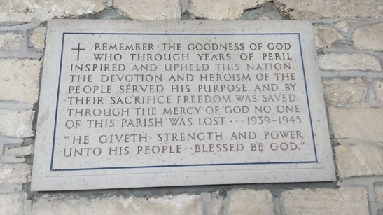 REMEMBER THE GOODNESS OF GOD / WHO THROUGH YEARS OF PERIL / INSPIRED AND UPHELD THIS NATINO / THE DEVOTION AND HEROISM OF THE / PEOPLE SERVED HIS PURPOSE AND BY / THEIR SACRIFICE FREEDOM WAS SAVED / THROUGH THE MERCY OF GOD NO ONE / OF THIS PARISH WAS LOST....1939 - 1945 / "HE GIVETH STRENGTH AND POWER / UNTO HIS PEOPLE .. BLESSED BE GOD."