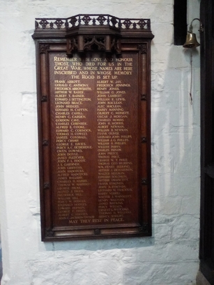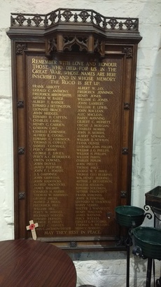 REMEMBER WITH LOVE AND HONOUR/ THOSE WHO DIED FOR US IN THE/ GREAT WAR, WHOSE NAMES ARE HERE/ INSCRIBED AND IN WHOSE MEMORY/ THE ROOD IS SET UP./[names in 2 columns]/MAY THEY REST IN PEACE.
