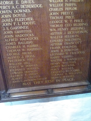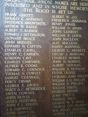 Column 1-FRANK ABBOTT.; GERALD C ANTHONY.; FREDERICK ARROWSMITH.; ARTHUR W.BABER.; ALBERT T. BARKER.; EDWARD J.BETTINGTON.; LEONARD BRACE.; JOHN BRIDGES.; EDWARD H.CAFFYN.; CHARLES CAHILL.; HENRY C.CARDEN.; GORDON CAVE.; CHARLES CHIRNSIDE.; ALFRED E.COOKE.; EDWARD C.CORNOCK.; THOMAS H.COWLES.; SAMUEL COXSHALL.; PERCY CRUMP.; GEORGE E.DAVIES.; PERCY A.C.DETHERIDGE.; OWEN DOWNES.; JOHN DOYLE.; JAMES FLETCHER.; JOHN F.L.FOOTIT, J.S.GARDINER.; JOHN GRIFFITHS.; JOHN HADCOCKS.; ALFRED HADCOCKS.; JAMES HALLIDAY.; CHARLES H.HARRIS.; THOMAS W.HARRISON.; GEORGE HICKS.; ALFRED J.HIGGS.; FREDERICK HILL.; WILLIAM HILL.; PERCY W.HODGES.; REGINALD HODGES.; EDWARD HOPSON.; GEORGE F.HURRY.; ROBERT C.HUGHES.; JOHN C.JACKSON-TAYLOR.; Column 2-ALBERT W.JAY.; FREDERICK JENNINGS.; HENRY JONES.; WILLIAM G.JONES.; JOHN LAMBERT.; WILLIAM E.LEWIS.; JOHN MACLEAN.; ALEC MACLEAN.; HARRY MANNING.; GILBERT C.MERRETT, OSCAR J.MORGAN.; CHARLES MORRIS.; JOHN H.MORRIS.; ALBERT NEWMAN.; WILLIAM B.NEWMAN.; FRANK OLIVER.; LEONARD JOHN PHILLIPS.; WILLIAM J.G.PHILLIPS.; WILLIAM H.PHILLIPS.; WILLIAM PHIPPS.; CHARLES PEPLOW.; JOHN PREECE.; THOMAS PRICE.; GEORGE W.T.PRICE.; THOMAS GEO. REDDING.; WM. HENRY REDDING.; ARTHUR J.RICHARDSON.; WALTER SELMAN.; EDWARD SOLOMON.; ARTHUR SWAINCOTT.; FRANK SYMONDS.; JOHN B.SYMONDS.; LEONARD W.THACKWAY.; HARRY VERRILL.; WALTER J.WAINSCOTT.; HENRY WALTERS.; JAMES WATKINS.; PERCY WEEKS.; ERNEST G.WITCOMB.; THOMAS H.WILLIAMS.; SIDNEY WRIGHT