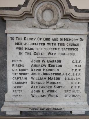 TO THE GLORY OF GOD AND IN MEMORY OF/MEN ASSOCIATED WITH THIS CHURCH/WHO MADE THE SUPREME SACRIFICE/IN THE GREAT WAR 1914-1918/[names]/"UNTIL THE DAY BREAK!"