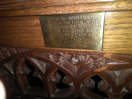 GIFTED ALONG WITH £200 FOR/ BEHOOF OF THE POOR OF THE/ CONGREGATION BY WILLIAM STRACHAN/ BALQUHAIN MAINS/ IN MEMORY OF HIS SON/ HECTOR/ WHO WAS KILLED IN ACTION/ ON OCT 12TH 1918