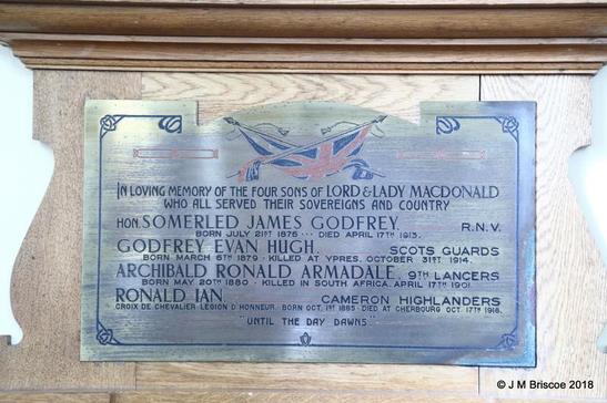IN LOVING MEMORY OF THE FOUR SONS OF LORD & LADY MACDONALD/WHO ALL SERVED THEIR SOVEREIGNS AND COUNTRY/[names]/"UNTIL THE DAY DAWNS"