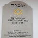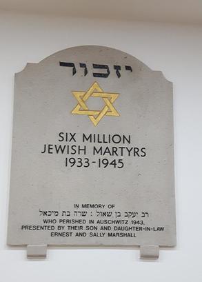 (Hebrew Inscription) / SIX MILLION / JEWISH MARTYRS/ 1933-1945 / IN MEMORY OF / (Hebrew Inscription) / WHO PERISHED IN AUSCHWITZ 1943. / PRESENTED BY THEIR SON AND DAUGHTER-IN-LAW / ERNEST AND SALLY MARSHALL
